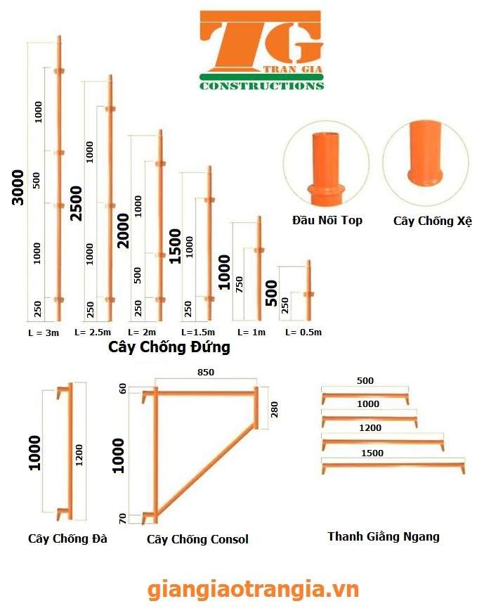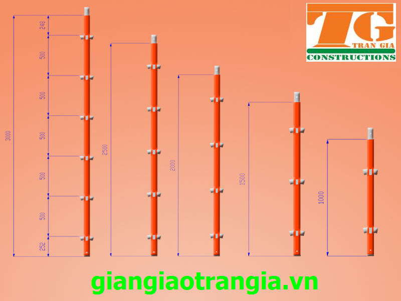 Cây chống đứng bao gồm: 3m, 2.5m, 2m, 1.5m, 1m